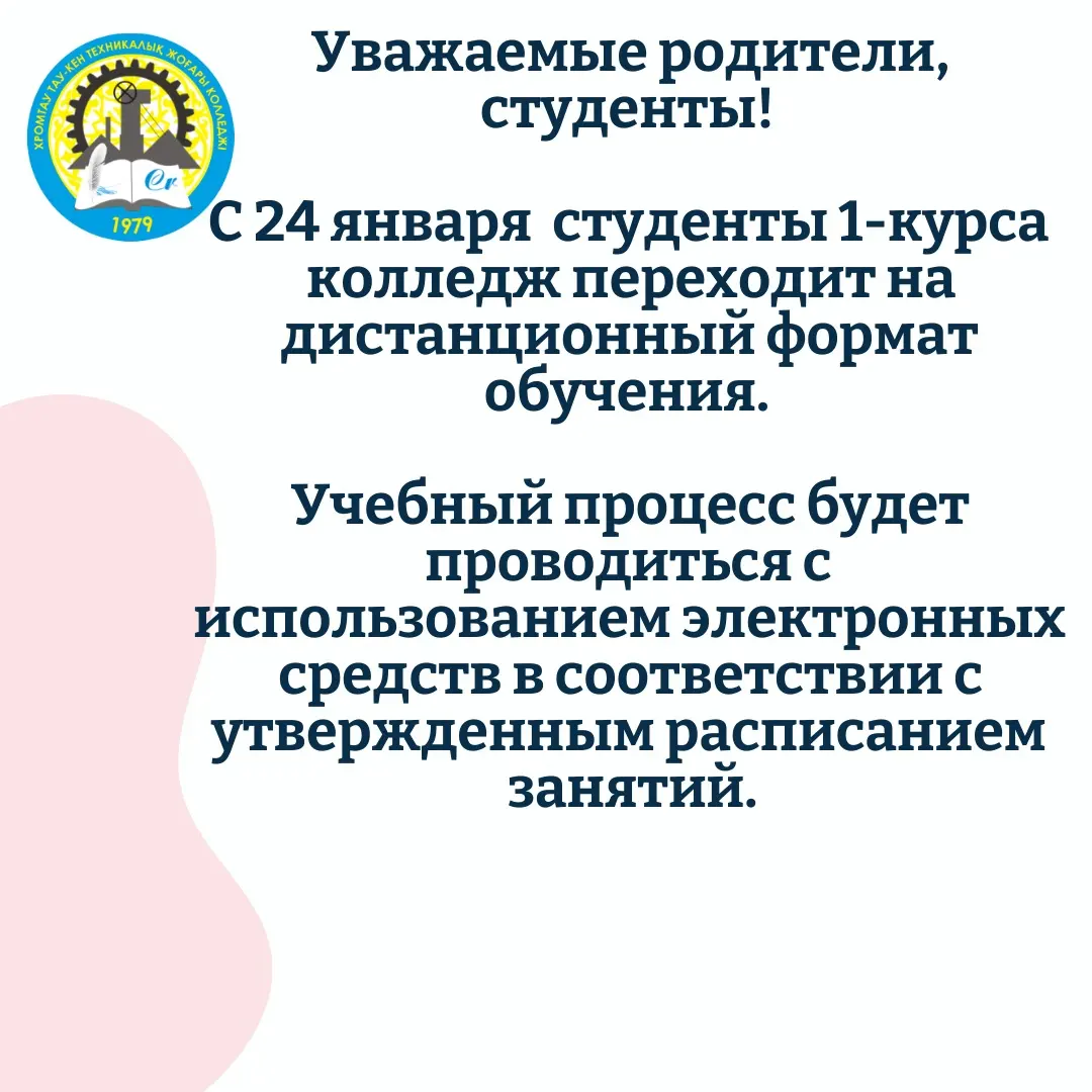 І курс студенттері толықтай онлайн форматта білім алуда. Білімалушылар «Платонус» оқу платформасында сабақ кестесіне сәйкес оқу тапсырмаларын, дәрістер мен сабақтарды оқиды. ІІ,ІІІ курс студенттері үшін әр түрлі уақытта сабақ кестесі жасалып, қоңырау уақыттары өзгертілді. Кабинеттік жүйе тоқтатылып, әрбір топ бір кабинетте отырғызылды. Оқу кабинеттері мен шеберханаларда санитарлық «тазалық аумағы» дайындалған. Колледж ішінде бетперде кию режимі мен мед. бақылау күшейтілді. Әрбір 2-ші сабақтан соң желдету, дезинфекциялау және кварцтау жұмыстары жүргізіледі.